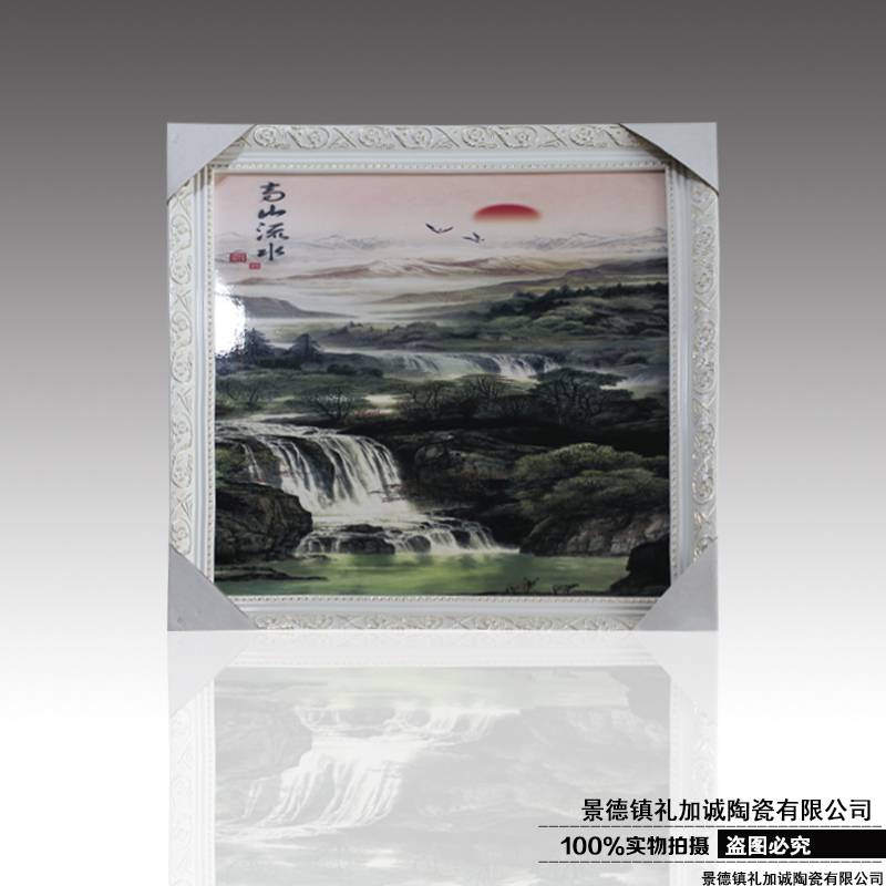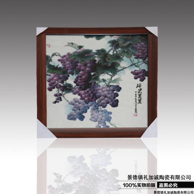 明代瓷板画有青花、青花釉里红、斗彩、五彩几种,但瓷板画作品远没有器皿类陶瓷多。现存于世的瓷板画有两种:一是镶嵌于家具和其他生活用具之上的附属物,二是明代中期已开始成为独立绘画形式的瓷板画。从明代嘉靖年间的《婴戏图。青花瓷板大漆盒》可以看出当时瓷板镶嵌十分讲究。该漆盒盖面由大小不一、形状各异的11块瓷板画。其中一块方形瓷板绘嘉靖朝最盛行的十六子戏春图,图中的儿童有的拜先生,有的斗蟋蟀,有的骑马,有的拖车,有的结花灯````个个生动活泼。“十六子”典出《左传》,后为称颂皇帝的辅佐大臣。整个作品青色浓艳、蓝中泛紫。传世的明代瓷板画大多属镶嵌类别,并非独立绘画形式的瓷板画,以下两件作品的内容不同,形式有别,也可见一斑。 明隆庆《祥云飞雁`青花瓷板画》为正方形,胎质较粗,釉色莹厚,四边有镶嵌的凹棱。画面以勾线填染之法绘海水江崖、折枝牡丹、瑞气祥云和一对飞雁。线条粗涩凝重,染色浓淡分明,纹饰工整严谨,图案疏离有致。